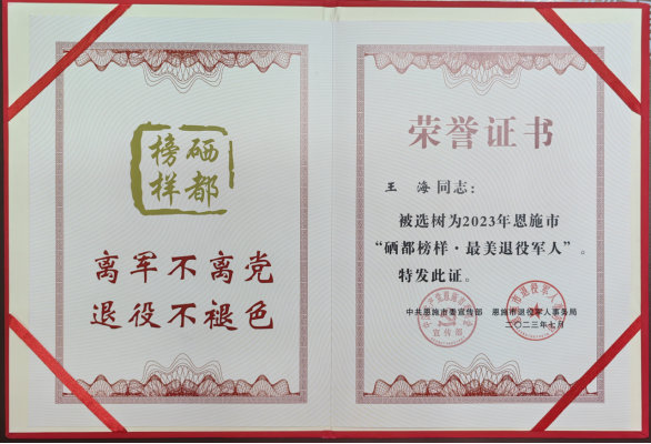 7月26日,恩施市“双拥共建促发展,同心共筑中国梦”纪念延安双拥运动80周年军地联谊文艺活动在恩施州工人文化宫广场精彩开演,从现场获悉,鄂旅股份大峡谷事业部党支部书记、总经理王海同志被选树为2023年恩施市“硒都榜样·最美退役军人”。