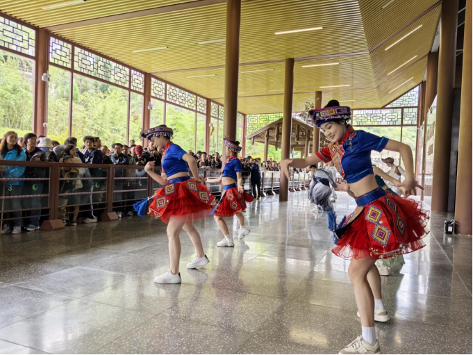 “十一”期间,在恩施大峡谷索道广场、地面缆车候车区,漆艺展示、恩施傩面具、手工布艺宝蓝等非遗展示,引来众多游客现场参与体验;国庆特色美陈供游客驻足打卡,土司NPC为游客提供独特的互动体验,并赠送伴手礼进行二次传播;游客、演员、员工合唱《我和我的祖国》,为国庆旅途添彩;每隔10分钟一场的快闪舞蹈,和不间断的茶艺表演让游客沉浸式体验土苗文化,让“排队不累,体验翻倍”。