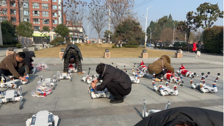 在这个过程中,网络环境的变化和户外场景的应用是机器狗表演的最大挑战。群控15只以上的“小狗”,不仅要兼顾灵活的动作,还要和舞狮表演默契配合,这对机器狗的技术团队提出了更高的要求。在登上恩施大峡谷舞台之前,在办公室、空地、广场都是团队排练和测试的阵地。团队还带着“小狗”们亮相武汉商圈,为的是在更多场景采集数据,让机器狗的表演更加迅速适应环境。