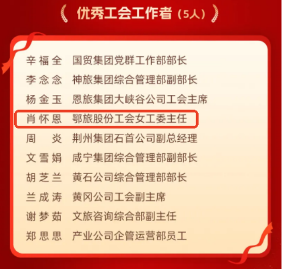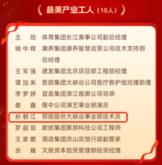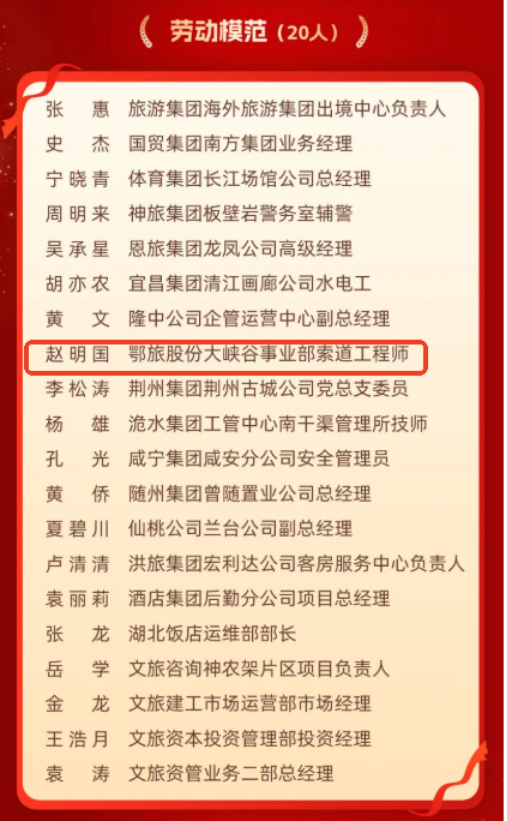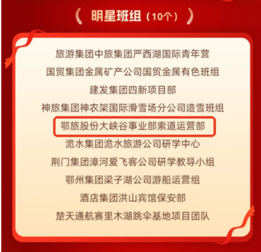 5月1日,从湖北文旅集团“五一”表彰获悉鄂旅股份获多项荣誉。大峡谷事业部索道运营部被授予“明星班组”,赵明国、张静、孙朝江、肖怀恩分别荣获“劳动模范”“巾帼标兵”“最美产业工人”“优秀工会工作者”称号。