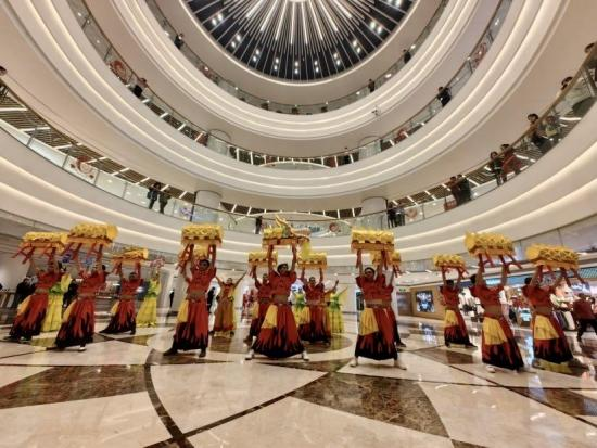 由湖北文旅集团鄂旅股份公司带来的“恩施板凳龙”“抬 石号子”两大非遗表演节目, 以“快闪”形式亮相武商梦时 代和武汉国际广场。
