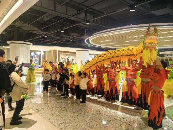 在武商梦时代,恩施非遗“板凳龙”大气亮相,非遗“抬 石号子 ”铿锵有力、催人奋进,吸引众多市民驻足观看。猜 灯迷、讲“龙”字成语、有奖问答,幸运观众拿起毛笔为“板 凳龙”点晴。在武汉国际广场,恩施板凳龙再次掀起高潮, 观众纷纷与“板凳龙”合影、拗造型,圈粉无数。